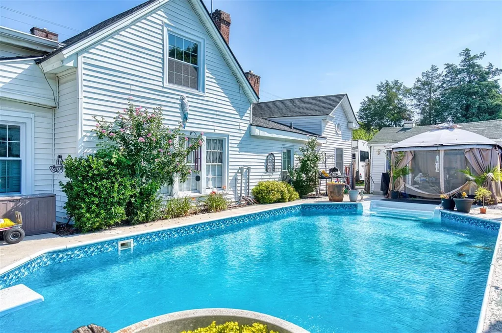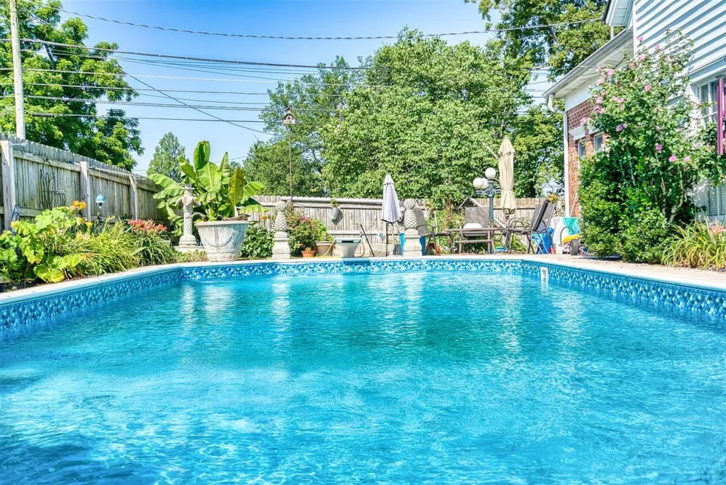 The kitchen is modern and spacious, and the backyard, with its cheerful gardens and in-ground pool, is a perfect private oasis.