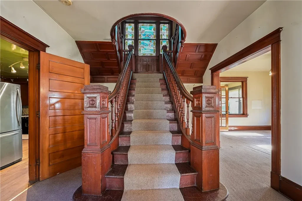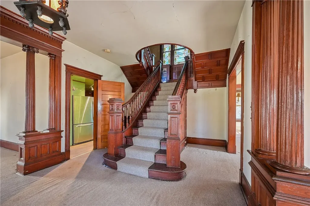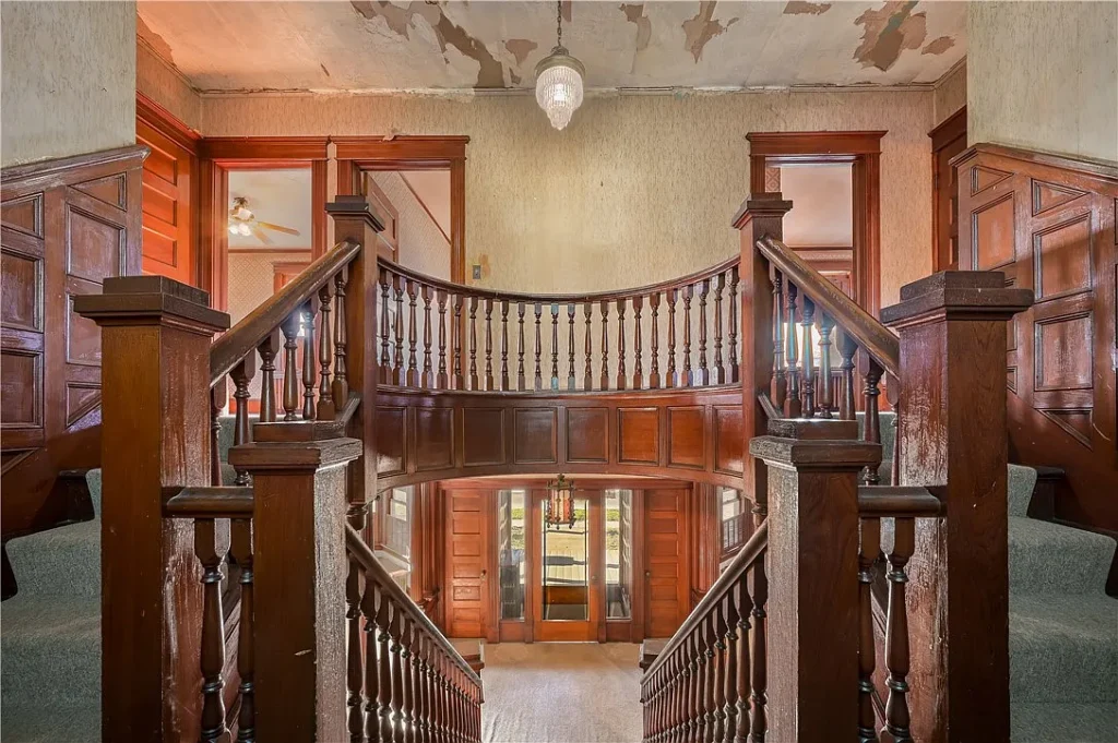 Your eyes are immediately drawn to the striking banister and staircase—the kind of rich, handsome woodwork that serves as the true heart of a historic house.