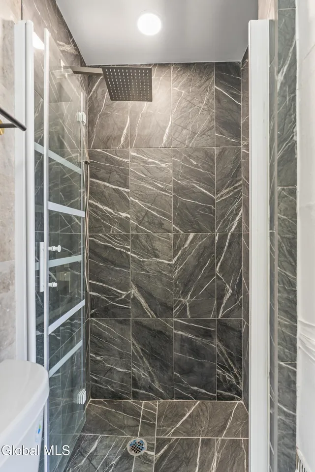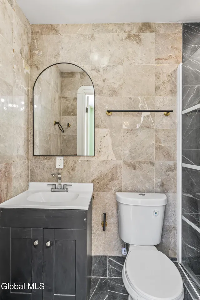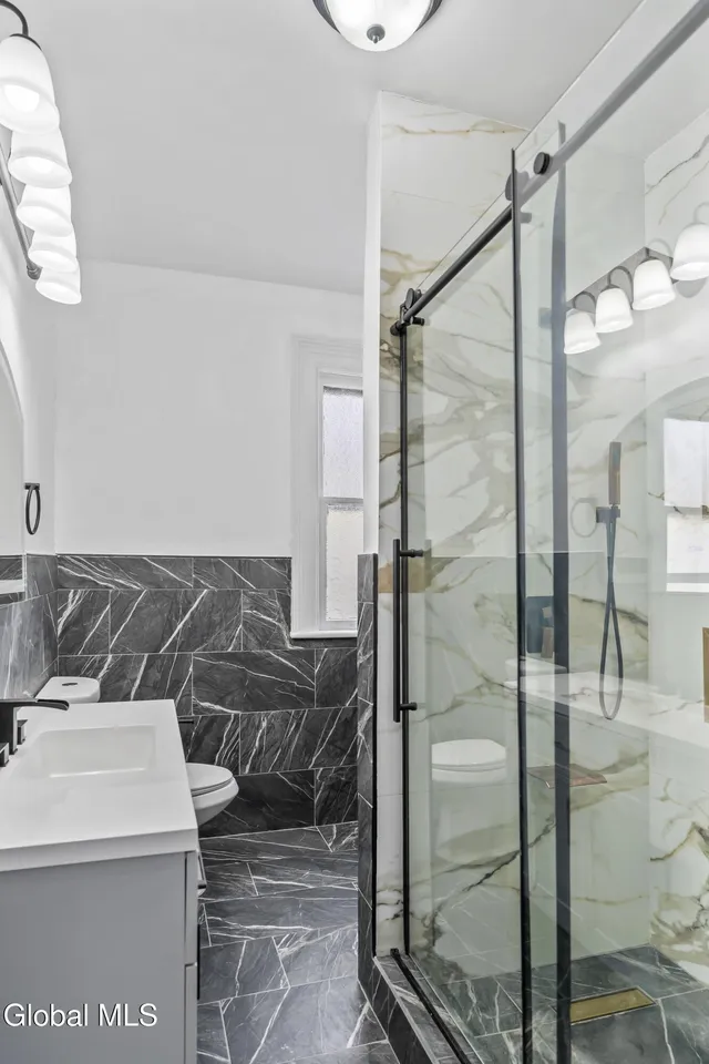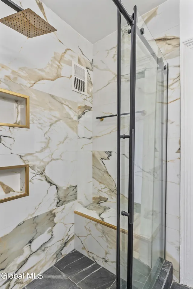 Two fully renovated bathrooms showcase upscale materials and a refined, spa-like aesthetic, blending style with comfort.