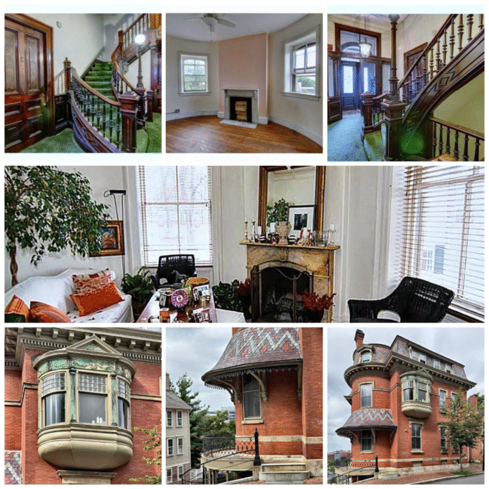 My eyes are immediately drawn to the details that make old-house lovers swoon: the heavily bracketed cornice that creates a dramatic, shadowed roofline; the tall, arched windows with their pronounced stone hoods; and the magnificent two-story projecting bay window that gives the facade a commanding, three-dimensional quality.