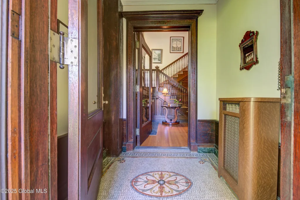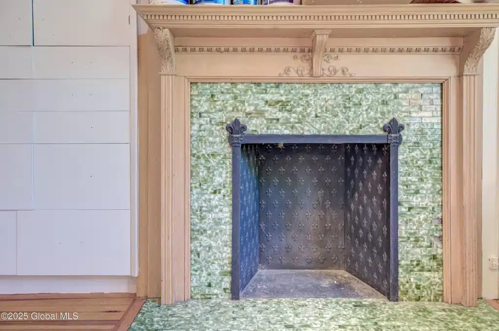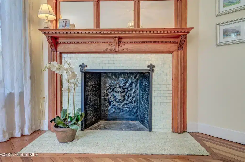 The home’s grand scale is felt in the soaring eight-foot pocket doors, which still glide effortlessly into the walls, and in the seven fireplaces, each graced with its own unique, one-of-a-kind cast iron insert.
