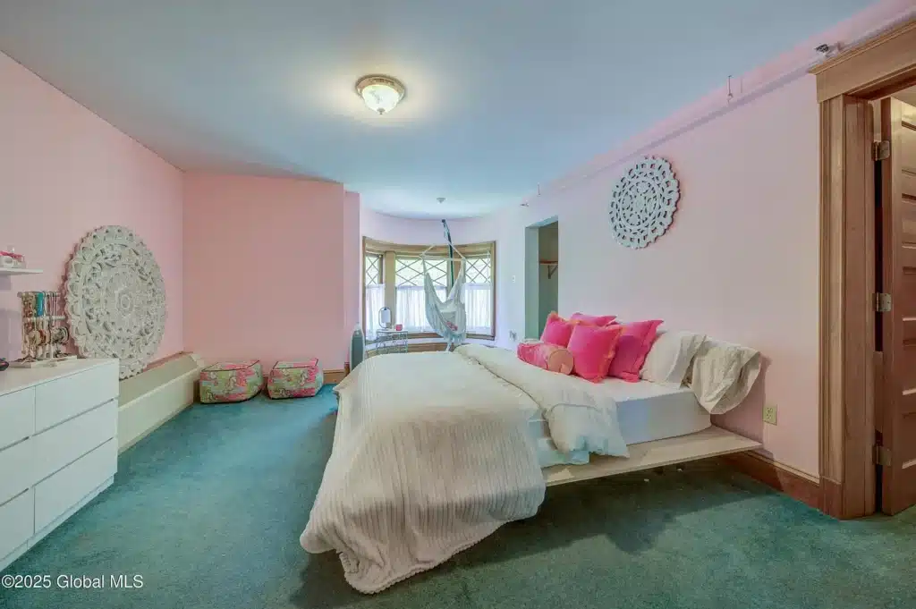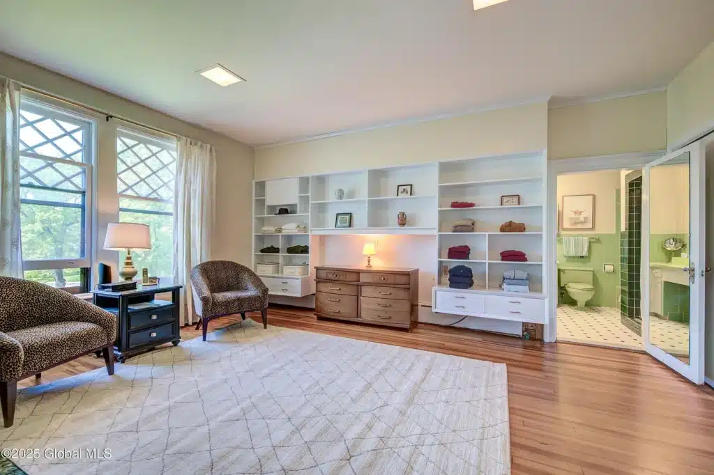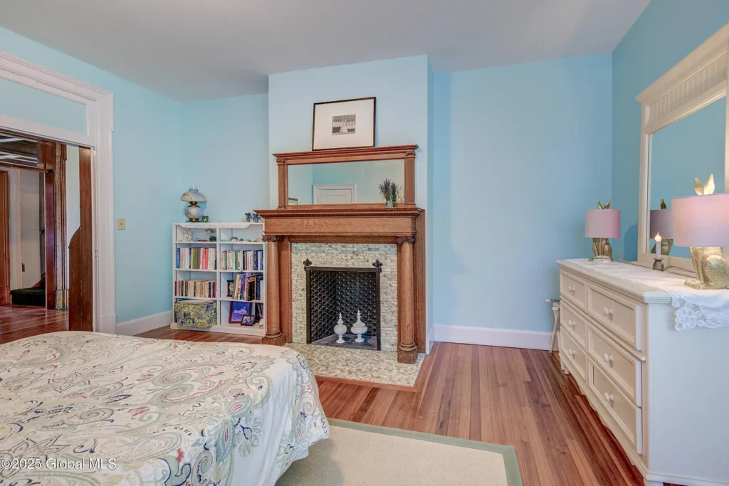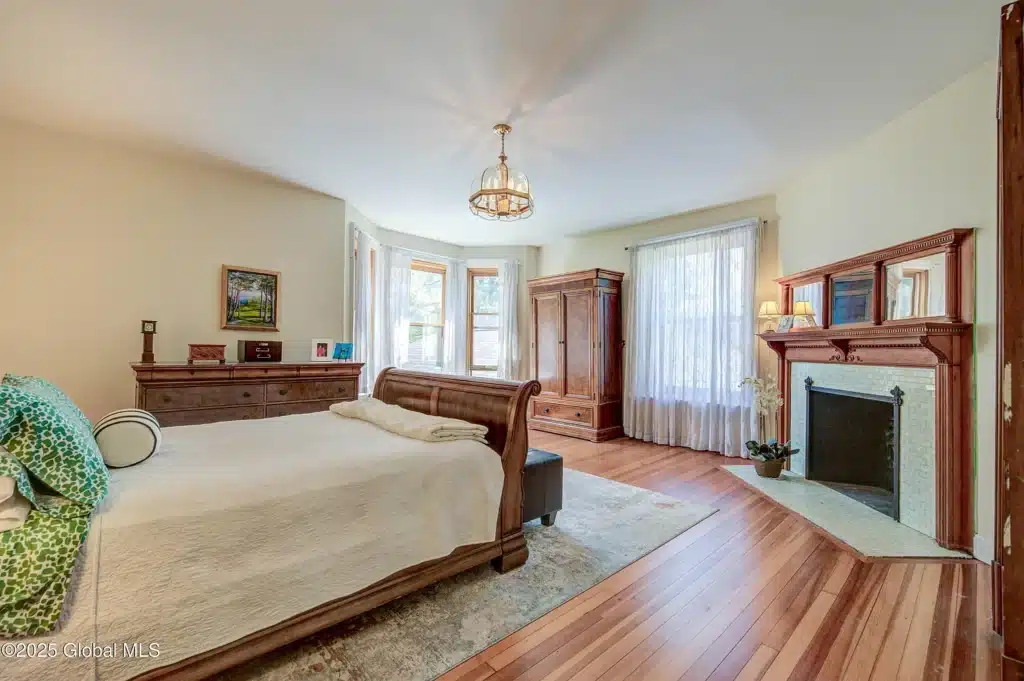 The primary suite, with its own dressing room and separate fireplaces in both the bedroom and sitting area, is a stunning glimpse into the Gilded Age lifestyle.
