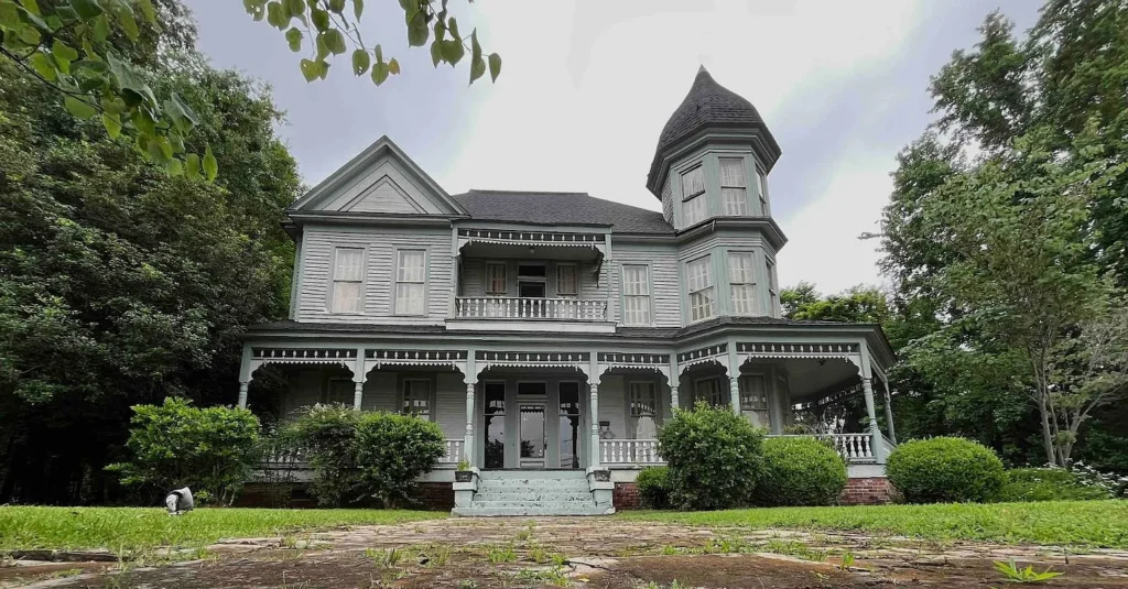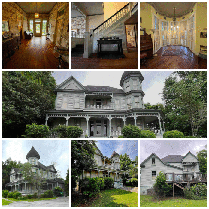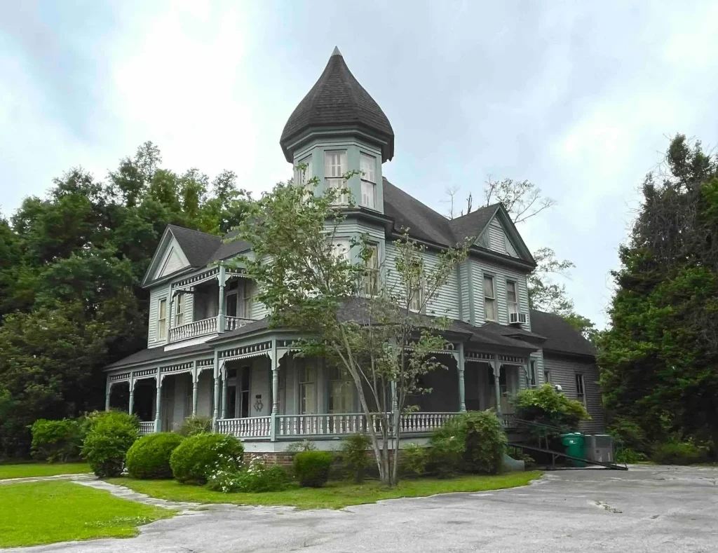 Architecture: Queen Anne style, with intricate details like heart pine wainscoting, tongue-and-groove pine flooring, and carved mantels with beveled mirrors.