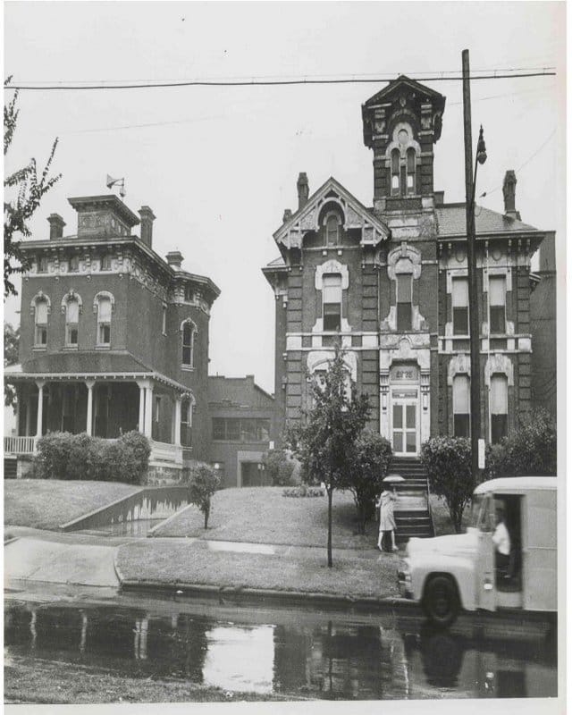 In the years 1939 to 1962, the Robert Russell Rhodes mansion served as a County Nursing Home. This undated photo (circa 1960) depicts the condition of the mansion and the Nelson Sanford mansion next door to it during this era. Image courtesy of Raymond L. Pianka Collection