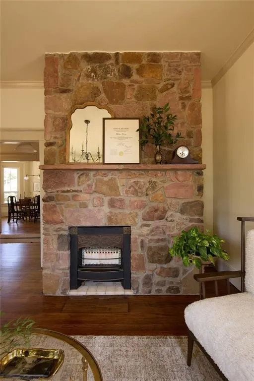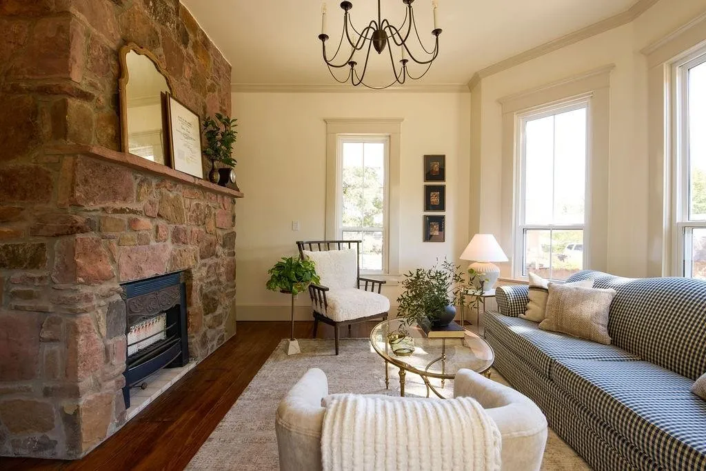 Step inside and be transported to a world where history and elegance intertwine. Renovated by Homegrown Design, the home boasts original wood flooring, soaring ceilings, and restored crown molding that honors its rich heritage. The living room, anchored by a stunning stone fireplace built with rocks sourced directly from the property, exudes warmth and sophistication.