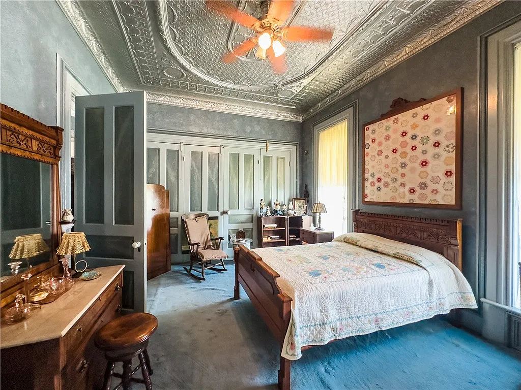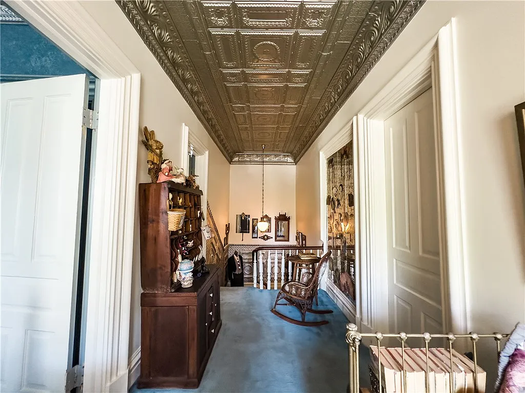The grand foyer welcomes you with a grand staircase accented with tin chair railing. The parlor has a built-in bookcase and marble fireplace. The dining room features large windows and spacious China closet.