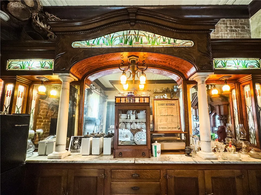The master suite features a fireplace and en-suite bathroom and opens to the sitting room with bay window and marble fireplace. The kitchen is charmed with a remarkable wood marble and stained-glass bar from the Marshall Candy Kitchen. Upstairs are three bedrooms with the potential for a 4th.