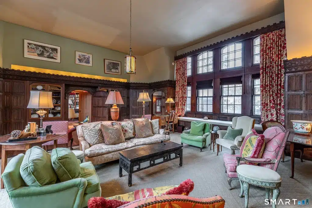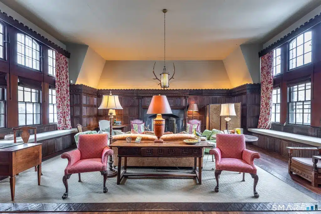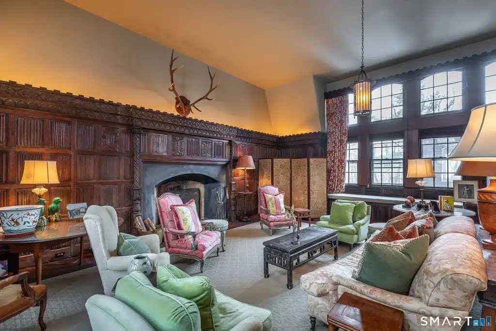 At the heart of the home, we are welcomed into a gracious and magical paneled room, a space that instantly defines the soul of the property. Rich wood paneling, generous proportions, and a large fireplace create a warm, inviting environment that feels both dramatic and deeply personal.