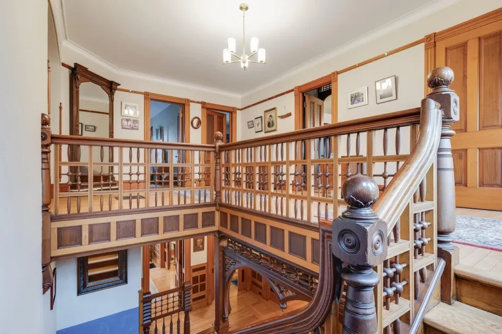 The interior is a museum-grade showcase of exotic and native timbers, each original to the home and restored to a deep luster: