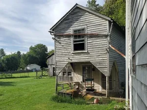 The vintage farmhouse includes 2 bedrooms, 1 bathroom, and enclosed front and back porches, which could be transformed into cozy sunrooms or additional living space. While the home is currently uninhabitable and in need of a full renovation, it holds historic charm and renovation potential for those with vision and creativity. Alternatively, the expansive acreage presents a wonderful opportunity to build a new custom home in a picturesque setting surrounded by natural beauty.
